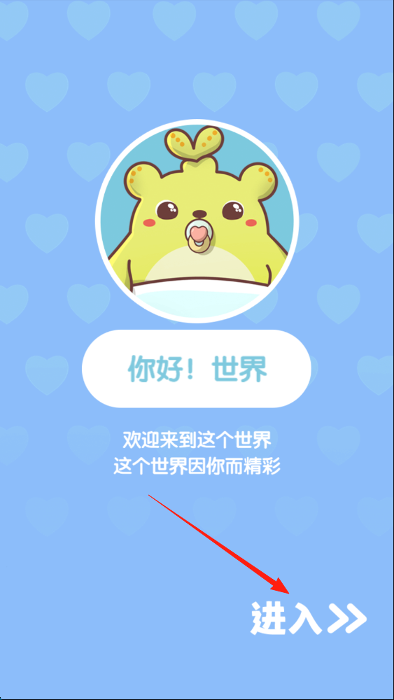 1、在游戏启动界面,看到可爱角色和欢迎语,点击“进入”按钮,进入游戏第1关。
