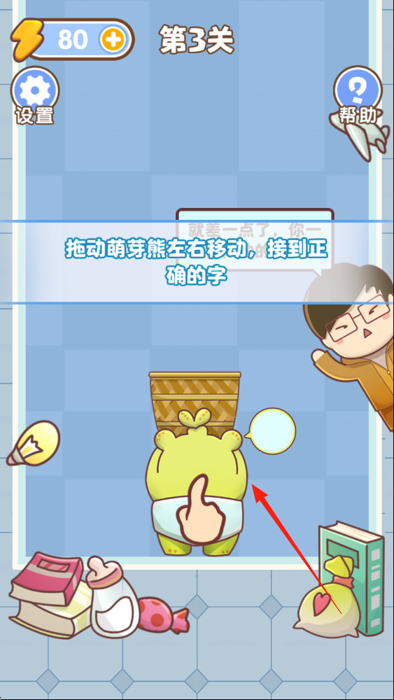 3、进入“第3关”,依照“拖动萌芽熊左右移动,接到正确的字”提示,操控萌芽熊完成接字任务。