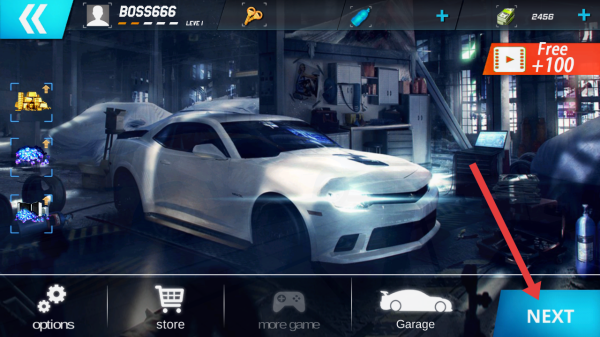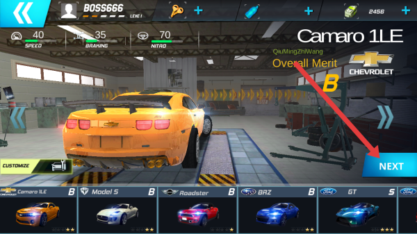 1、在疯狂漂移赛车城的车库界面点击【NEXT】,进入车辆操作环节,推进游戏流程,开启后续场景。