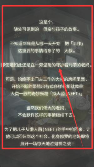 1、剧情引人入胜,游戏剧情围绕老妈拯救身陷NEET群的儿子展开,包含亲情等多种复杂情感,能让玩家产生强烈共鸣,沉浸其中。