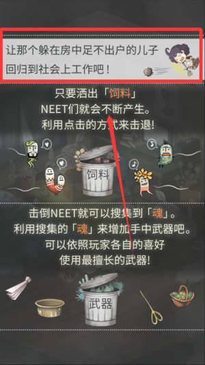 1、明确游戏目的,玩家主要目的是打倒大量涌进画面的妖精(NEET)来储存「魂」,将倒下的NEET登录图鉴,以全部收集为目标不断提升老妈武器威力。