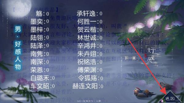 3、游戏设有诸多功能选项,如查看“个人属性”了解角色状态,关注“男好感人物”数值知晓与各男性角色好感,若需退出当前界面。