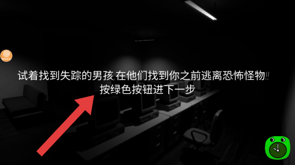 3、界面文字明确游戏目标(寻人、逃生)与操作(点击绿色按钮),场景设计烘托紧张氛围,引导玩家开启恐怖冒险体验,符合叙事与交互逻辑。