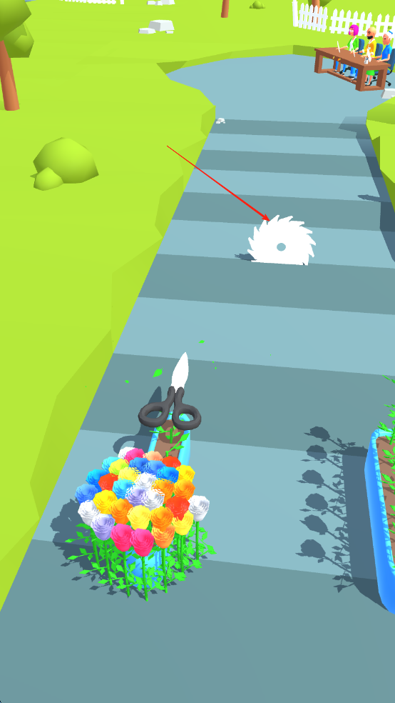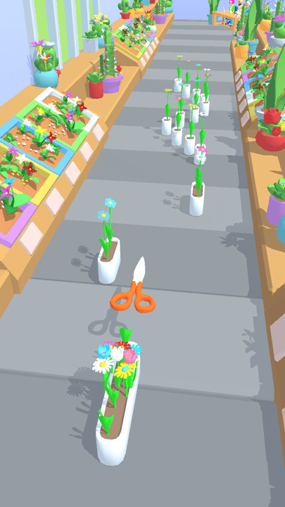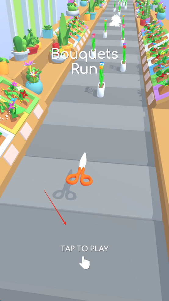 1、进入扎花束跑秀,操控初始剪刀踏上赛道,紧盯前方鲜花,滑动屏幕调整方向,完成首次花朵收集。