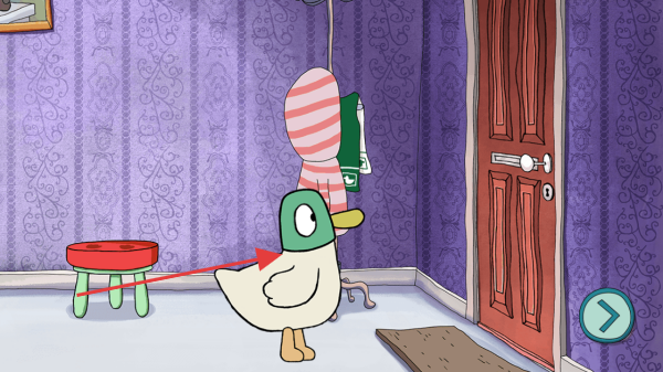 1、在紫色房间场景中,操控鸭子(或点击鸭子),探索红色凳子、门等物品,触发互动,开启游戏冒险。