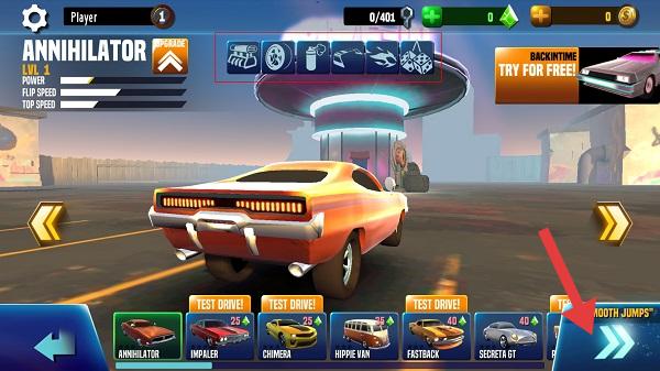 1、在游戏车库界面,可通过左右箭头浏览不同赛车,选择心仪的“ANNIHILATOR”等赛车,还能查看其属性,点击【TESTDRIVE】可试驾。