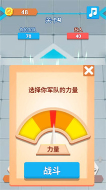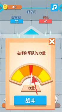 3、玩家在战斗前可选择军队力量等策略,合理规划战斗策略,增强己方队伍战斗力,以在对战中取得优势。