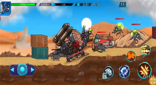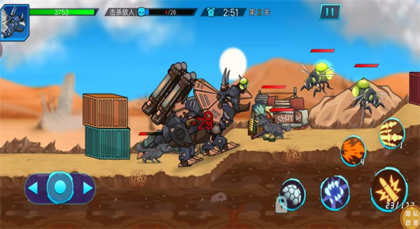 1、玩家在战斗场景中,通过屏幕下方的方向键操控机甲恐龙等角色移动,利用技能按钮释放技能。