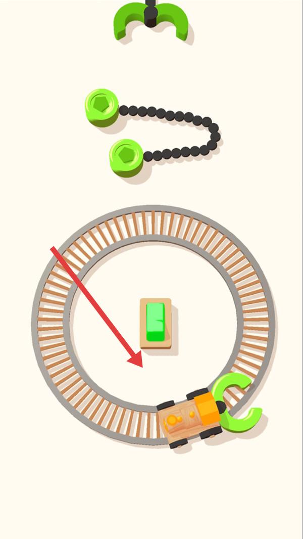 1、在游戏中观察绿色机械部件和轨道布局,将绿色链条部件合理放置在轨道相关位置,使小火车能够顺利运行。