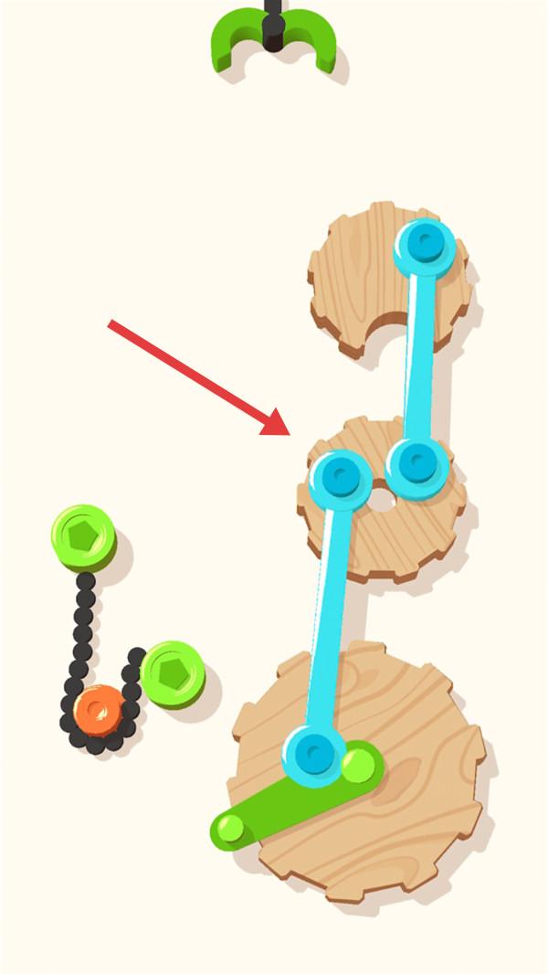 2、面对齿轮和链条组合关卡,分析蓝色齿轮与绿色链条的连接关系,正确摆放部件,让机械装置正常运转。