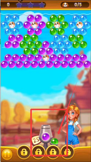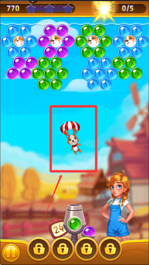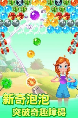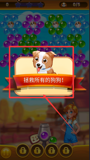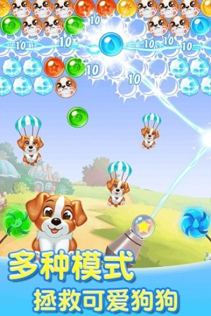 1、击破泡泡救狗,玩家通过移动魔法大炮,发射泡泡击打困住可爱狗狗的泡泡,需巧妙击中,使泡泡破碎,将狗狗从泡泡中解救出来。