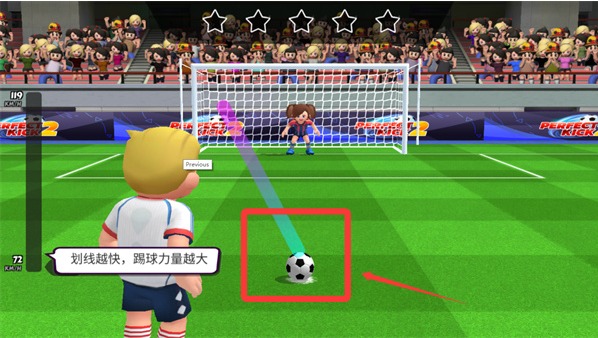 2、向球门滑动手指,球会被踢向划的方向,划线越快,球的速度就越快。