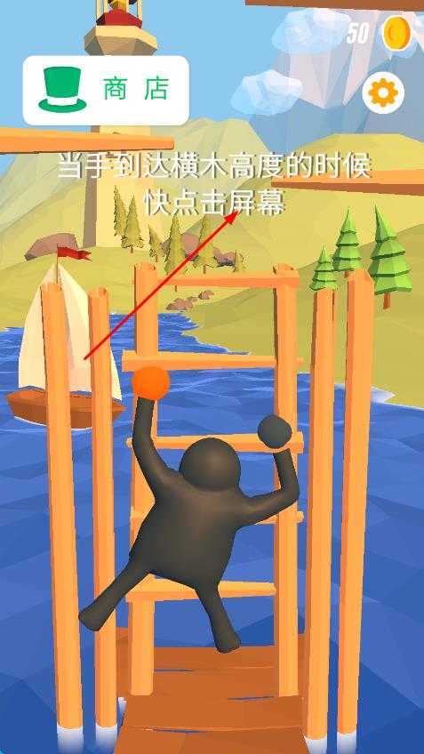 1、进入游戏后观察场景布局,点击屏幕控制小人双手交替抓取攀爬点,调整节奏向上移动,避免停滞被洪水淹没。