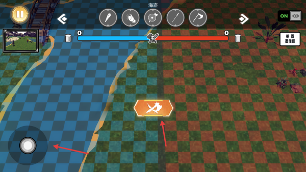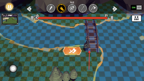 3、根据战场形势,点击屏幕上方的武器图标切换武器,合理运用武器对敌方如海盗发起攻击,朝着敌方据点如桥梁处推进,争取赢得战斗胜利。