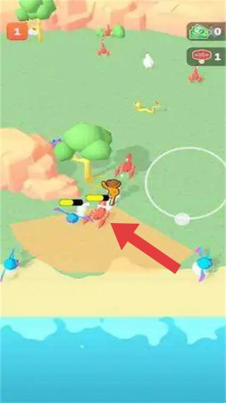 1、玩家操控角色在卡通风格的场景里进行捕捉操作,画面里角色身旁有箭头指示,引导玩家捕捉特定目标,通过在场景中探索、捕捉各类生物。