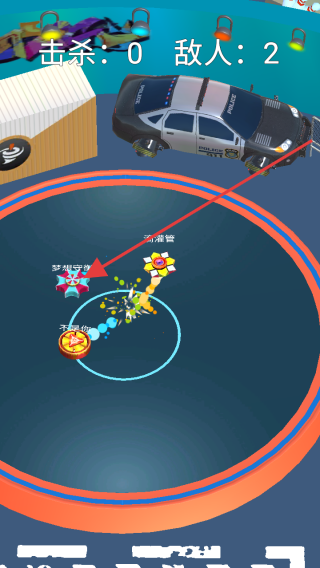 3、进入游戏对战场景后,操控己方游戏角色,与对手展开战斗,屏幕上方显示【击杀:0敌人:2】,需努力击败敌人。