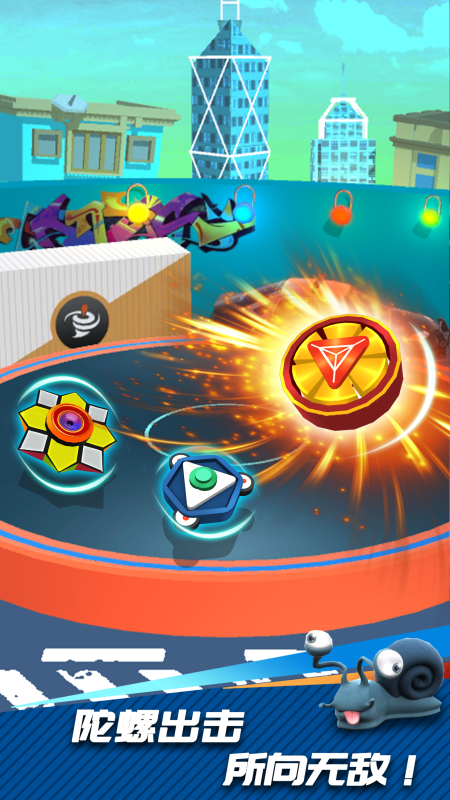 1、爆裂视觉表现:3D渲染呈现陀螺金属质感与流光特效,高速旋转时触发“动态模糊”,撞击瞬间迸射“火花粒子”,搭配慢动作特写,强化战斗爽感。