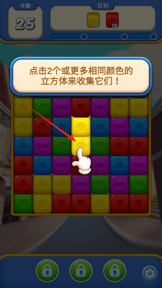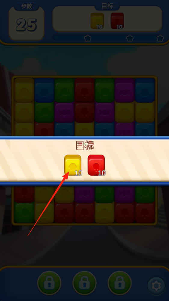 1、明确关卡目标为收集10个黄色和10个红色立方体,在25步内规划消除策略。