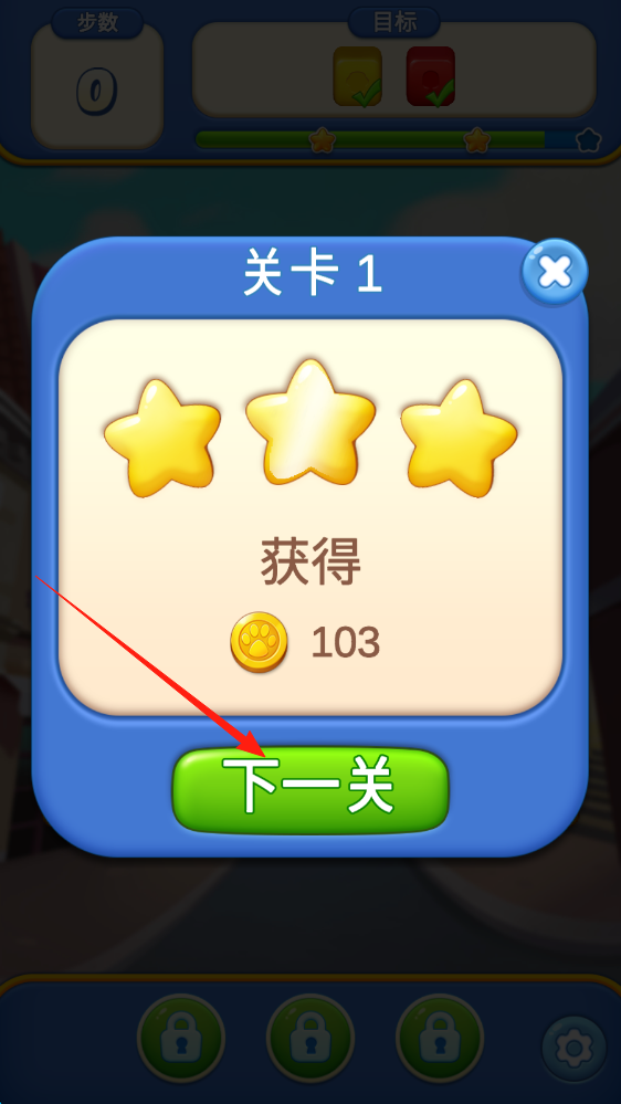 3、完成关卡目标获得三星评价和奖励后,点击“下一关”按钮,进入新的关卡挑战。