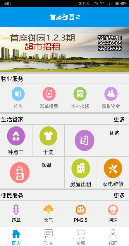 1.为用户提供生活服务、便民服务、物业缴费、停车位租用购买、网上超市等功能。