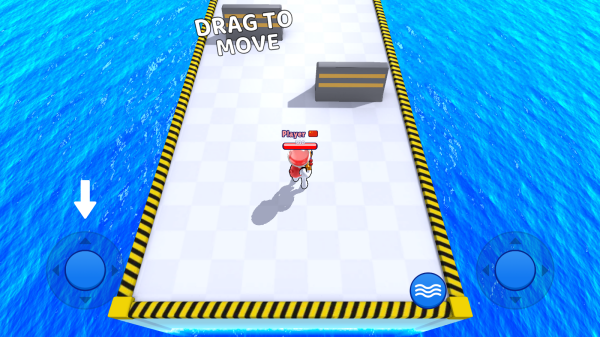 2、展示了移动操作场景(通过拖动控制角色移动),背景为蓝色水域上的跑道式平台,左右两侧有控制按钮,属于动作类跑酷的界面元素。