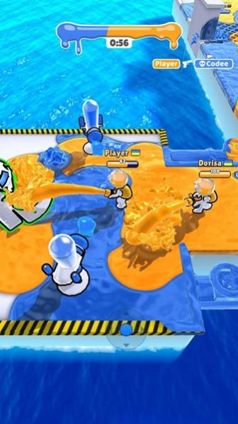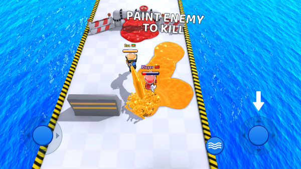 3、展示了玩家角色与敌人在水上跑道场景中的互动,左右两侧有蓝色圆形控制按钮(用于移动或操作涂色攻击),体现了涂色攻击的核心机制与场景设定。