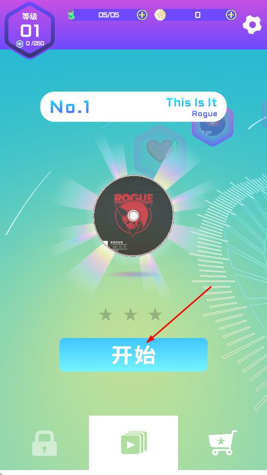 1、打开游戏后,在主界面歌曲列表中,点击选择一首喜欢的曲目,进入3D赛道场景,点击【开始】按钮启动游戏。