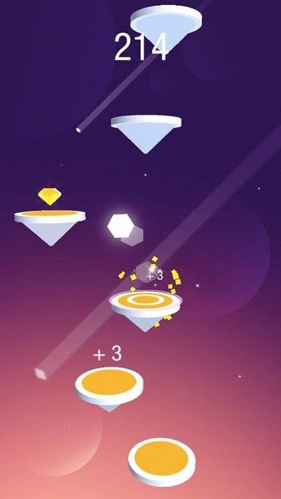 2、下落过程中滑动屏幕切换小球颜色,使其与当前跳板颜色保持一致,同时注意收集金色能量点,攒满后可激活无敌冲刺状态突破复杂障碍。