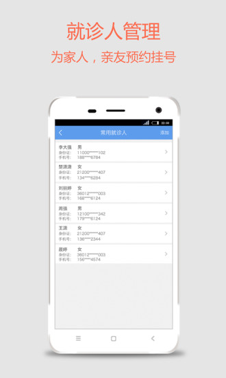 5.常用就诊人管理:可以给家人、朋友、亲戚等进行预约挂号与门诊信息管理。