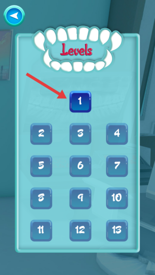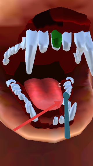 3、在游戏关卡中,使用工具(如箭头所指工具)对动物口腔进行操作,完成牙科任务。