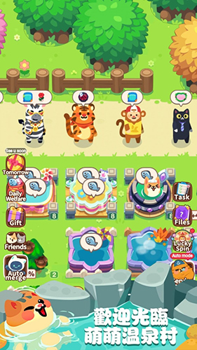 萌萌温泉村是一款治愈萌宠养成模拟经营作品,采用可爱清新的卡通画面,玩家化身喵掌柜经营森林动物温泉馆,通过建造温泉、合成设施、布置景观满足小动物需求,吸引顾客赚取鱼币和宝石,升级解锁果汁店、马杀鸡馆等场景,目标是打造世界一流的森林动物温泉村。