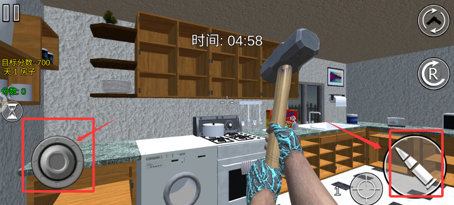 2、左手虚拟摇杆操控角色移动,可点击右下角按键武器进行攻击。