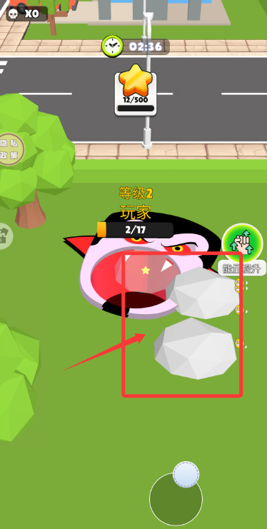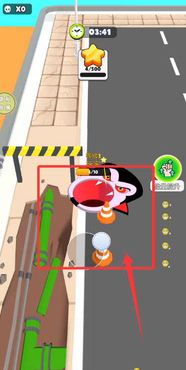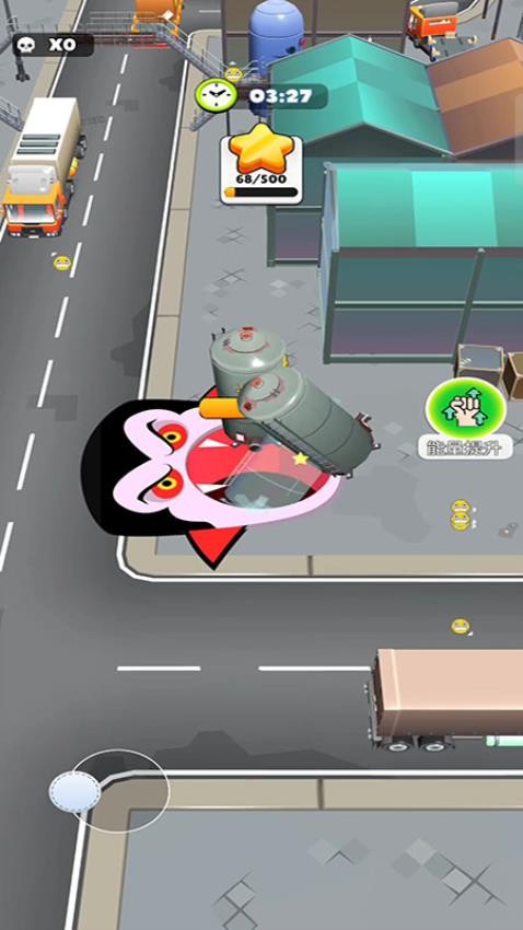 2、手指左右滑动控制移动轨迹,沿途吸纳车辆、树木等物品壮大自身规模。