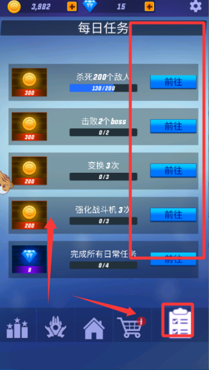 1、初期优先完成新手任务解锁基础战机,熟悉基础操作如移动、射击和躲避。