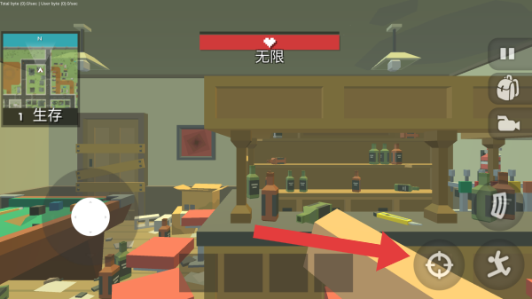 2、界面上方无限代表生命值或某种资源处于无限状态,左侧生存表明游戏模式为生存类,右下角有瞄准、攻击等操作按键,整体来看是第一人称视角的生存类型。