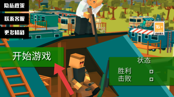 1、画面中【开始游戏】按钮提示玩家可点击进入,状态、栏显示、胜利、击败用于记录相关结果,从画风看类似沙盒或生存类型。