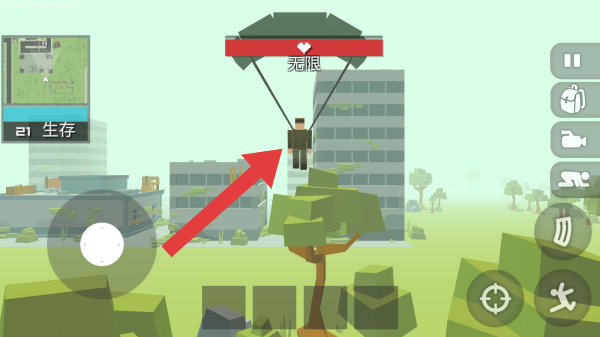 3、画面中角色正借助降落伞降落,上方无限表示角色生命值或某种资源处于无限状态,左侧表明模式为生存类,还有小地图辅助玩家了解环境。