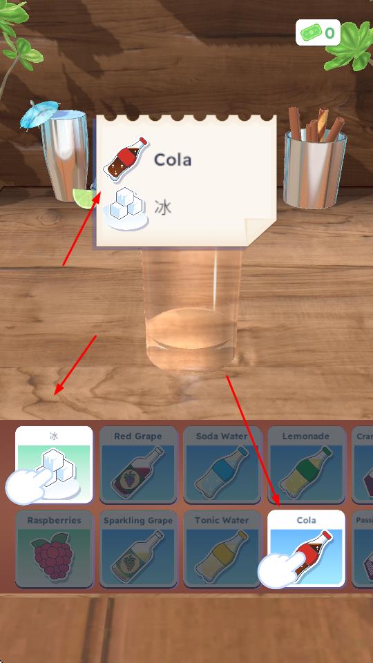 1、玩家按照订单要求,选择正确的原料添加到容器中,完成饮品制作。