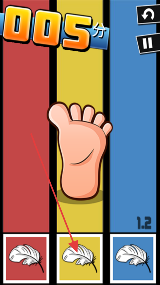 3、游戏过程中,根据屏幕上脚的位置,按红色箭头指向点击对应颜色区域内的羽毛图标,获取分数并推进游戏。