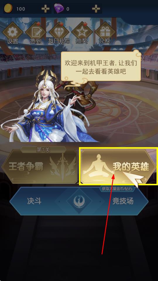 1、进入主界面,点击“我的英雄”(如截图黄色框所示),了解其属性(生命值、攻击力等)与技能,熟悉英雄系统,为战斗做准备。