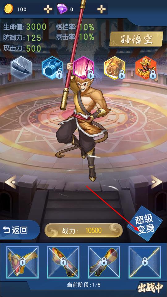 1、英雄养成:通过收集资源(金币、钻石)解锁装备(底部栏),提升英雄属性(战力、攻击力等),激活“超级变身”解锁特殊技能。