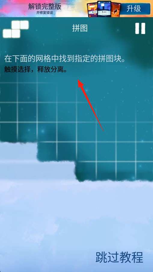 2、在拼图教程中,依据“在下面的网格中找到指定的拼图块,触摸选择,释放分离”的提示,操作寻找拼图块。