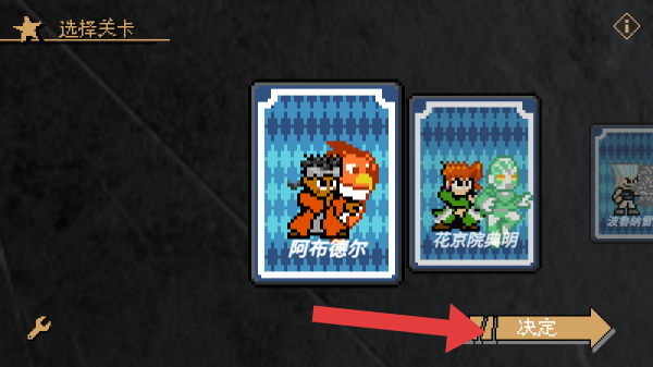 2、画面中展示了不同角色卡片,分别是阿布德尔、花京院典明,玩家选择相应角色卡片后,点击【決定】按钮,即可选定关卡或角色进入环节。