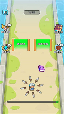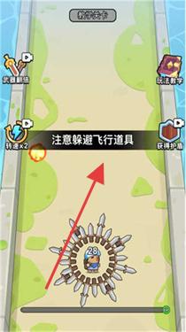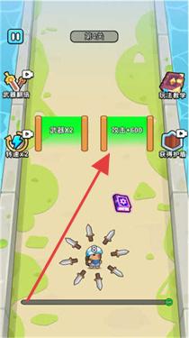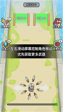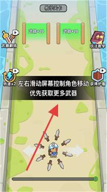 1、进入游戏关卡,根据屏幕提示,左右滑动屏幕控制角色移动,优先获取更多武器增强战斗力。