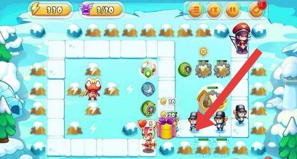 1、在冰雪关卡,操控角色(如红色小角色)移动,靠近礼物盒获取道具,同时布置防御(箭头指向敌人方向)。