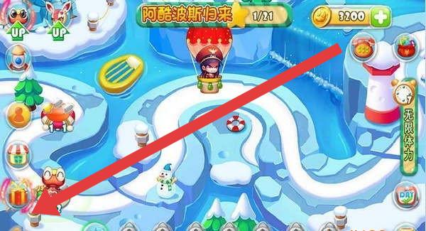 2、进入“阿酷波斯归来”地图(1/21),点击左侧礼物图标(箭头所指),领取奖励或道具,为后续关卡做准备。
