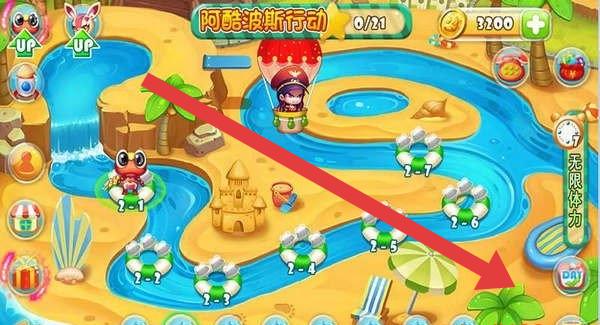 3、在“阿酷波斯行动”场景(0/21),沿河道(箭头方向)操控角色,利用场景元素(如浮圈、沙滩城堡)。