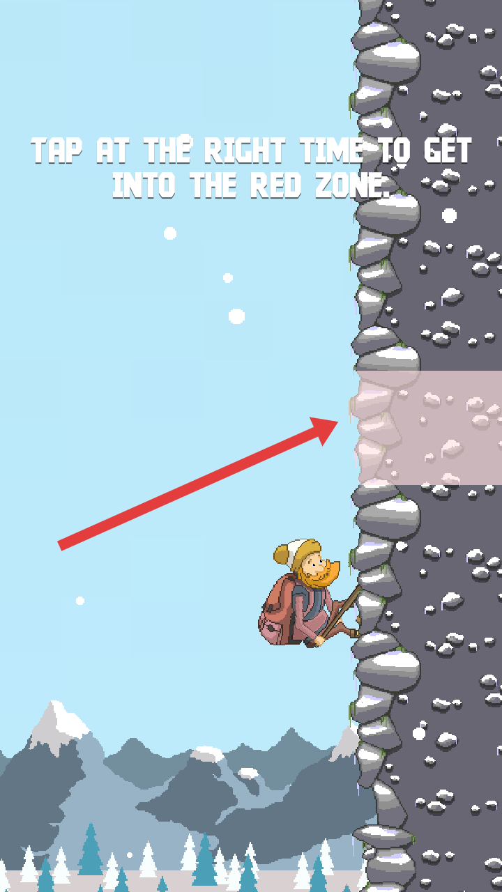 1、游戏开始时,按照提示在合适时机点击屏幕,让角色进入红色区域,这是攀爬的关键操作步骤。