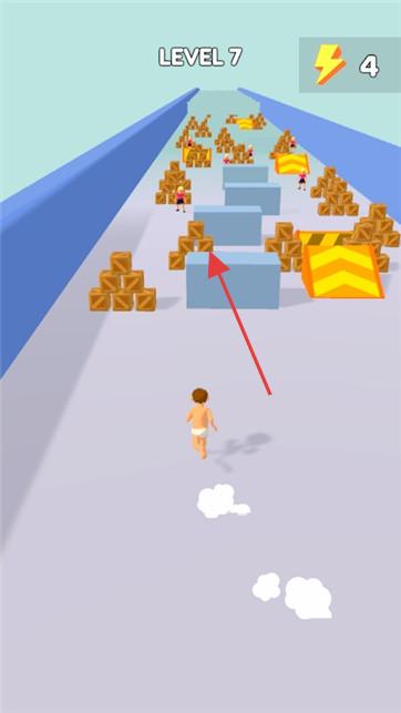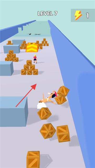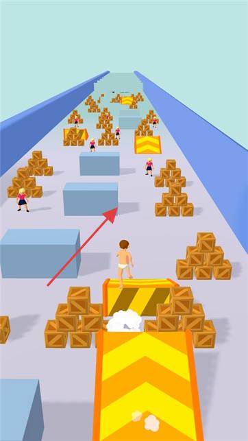 2、赛道上分布着木箱、蓝色方块等障碍物,玩家需灵活操作角色躲避,避免碰撞导致失败。