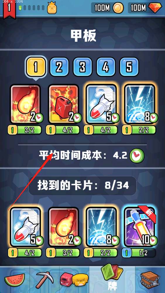 2、在“甲板”界面,关注技能卡片的属性、平均时间成本及获取进度,合理搭配卡片。
